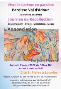 • Paroisse du Pays de Bagnères-de-Bigorre : 5 mars à Campan et 12 mars à Bagnères-de-Bigorre (salles à confirmer, informations auprès du secrétariat paroissial).