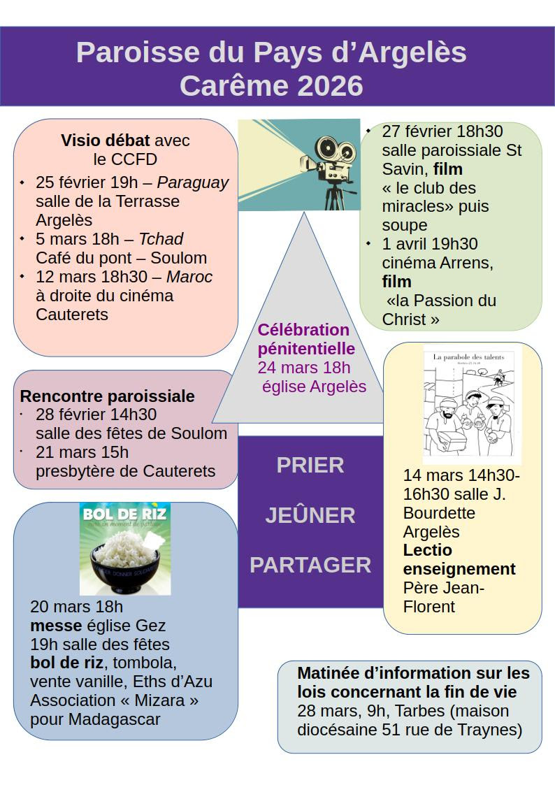 • Paroisse du Pays d’Argelès : 25 février à Pierrefitte avec le partenaire du Paraguay ; 5 mars à Argelès-Gazost, avec le partenaire du Tchad ; 12 mars à Cauterets avec le partenaire du Maroc. Une quatrième rencontre aura lieu dans le Val d’Azun (informations auprès du secrétariat paroissial).